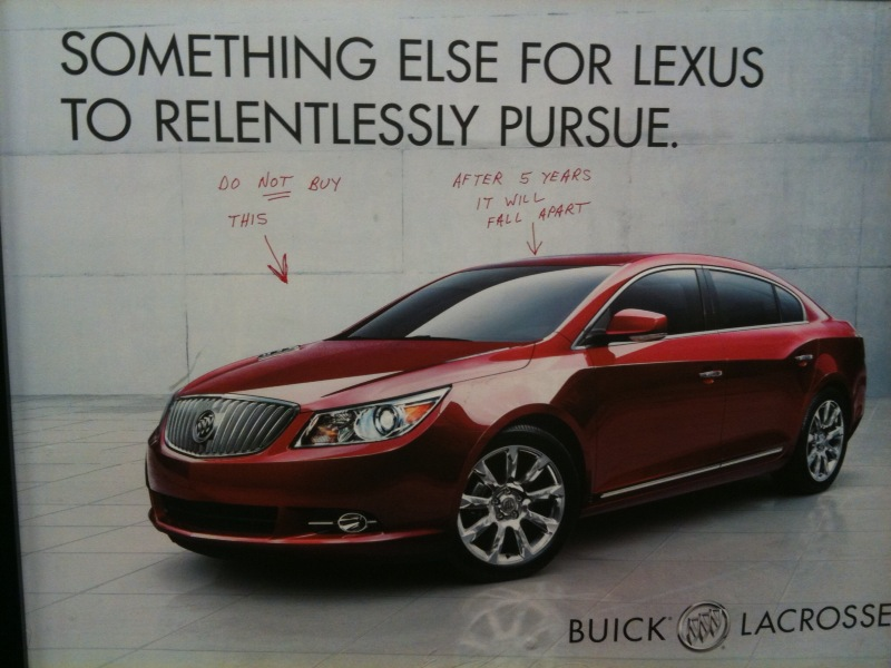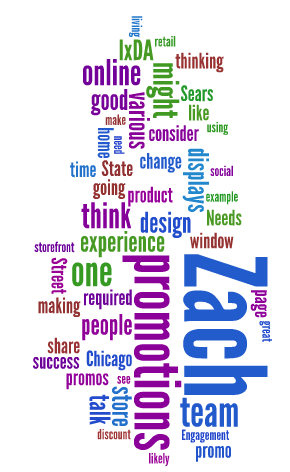 Then we went downstairs and out through the Sears Store that is below our offices. As we walked out we looked at the interior displays, such as the one’s from Land’s End and discussed how the role of interior displays and exterior window displays differ. The primary role of the exterior is to grab your attention and then get you in the store. The interior displays are to get you to put the merchandise in your shopping cart even if that item wasn’t originally on your “shopping list.” The interior display had merchandise for sale and the top of the rack had a colorful sign on it. The main technology for attention getting in use was the placement of the rack in the middle of a walk way. We saw that people actually had to maneuver around the rack to move throughout the store. It reminded us of an interstitial ad, interrupting the most direct path of the walkers.