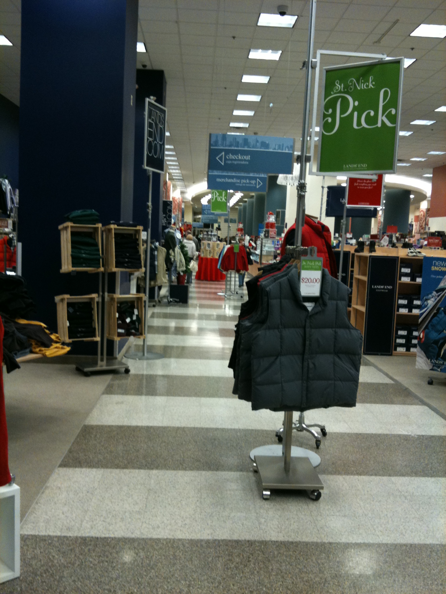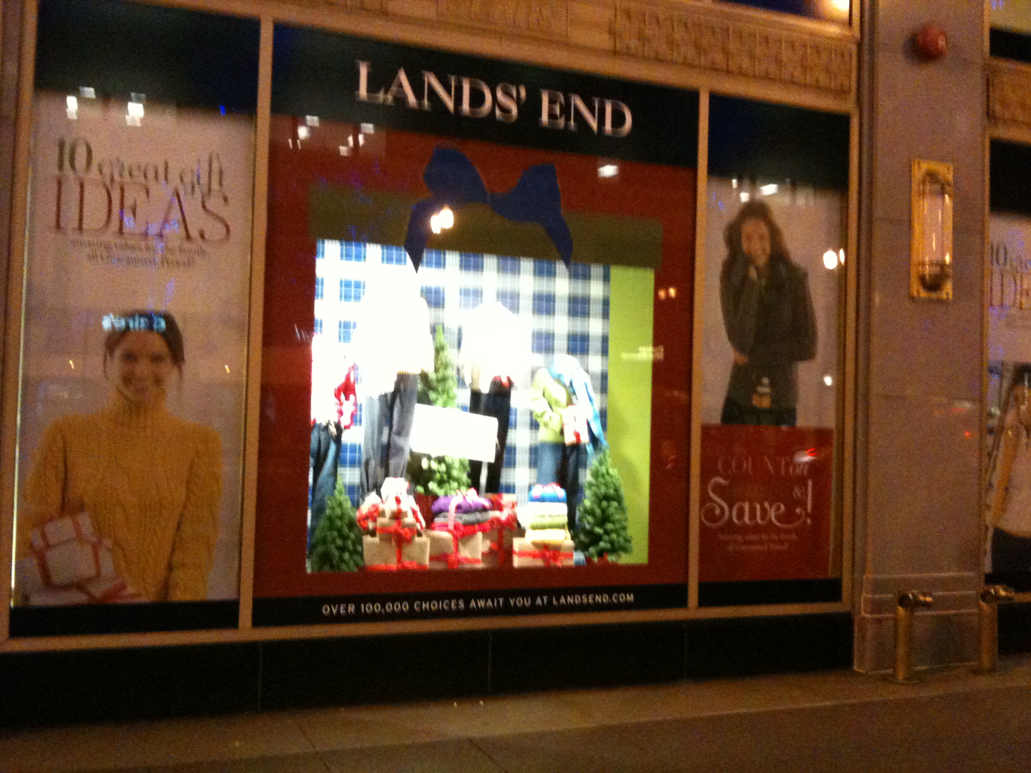 The exterior window display of Land’s End was really interesting. The display is surrounded by branding messages. One message called out “Save” while another told you there were 10 types of gift ideas you should look at. The other windows then took you through each of the 10 gift ideas. One thing we noticed was that the window display did not let the observer see into the store. There was a solid background. Also the items in the display were not all for sale. Some of the items were props, such as the sled and the little evergreen trees. We wondered how does one make a promo so that the “props” are not confused with the item we want people to be attracted to and to buy. IKEA is one store that seems to make large displays in which almost every single item is an item that one can purchase, including the pictures that are on the walls. As we watched the people walk by the windows, they seemed to not notice the windows until they were directly in front of them. Their angle of sight was very severe and not until the passerby was right on top did they look at the display.