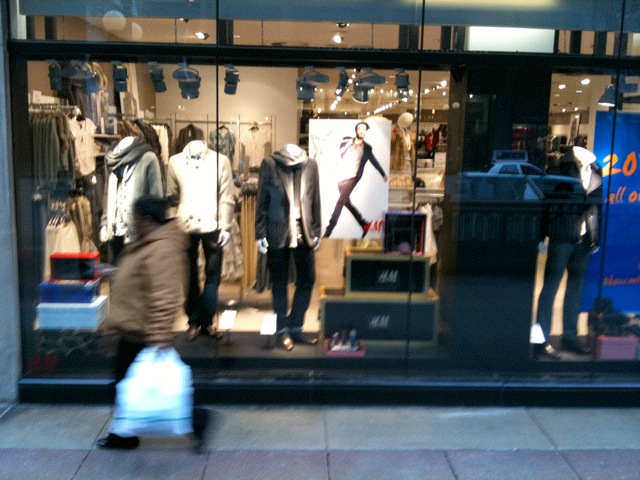 When we looked at the H&M window it was very different. There was a display, but there was no background so one could easily see the racks of merchandise. Also the display had groups of items, outfits. If you look near the bottom of each outfit you can see a price placard. But interestingly, they don’t sum up all the individual prices to show the price of the outfit. The H&M display was very effective at catching people’s attention. On the right side of the image you can see the 20% sign. The sign was at an angle and thus very easy to see while walking along. We even saw people stop to read the sign. This window display also allowed the passerby to look continuously to the side and not have their line of sight broken by window frames of structural wall supports.
